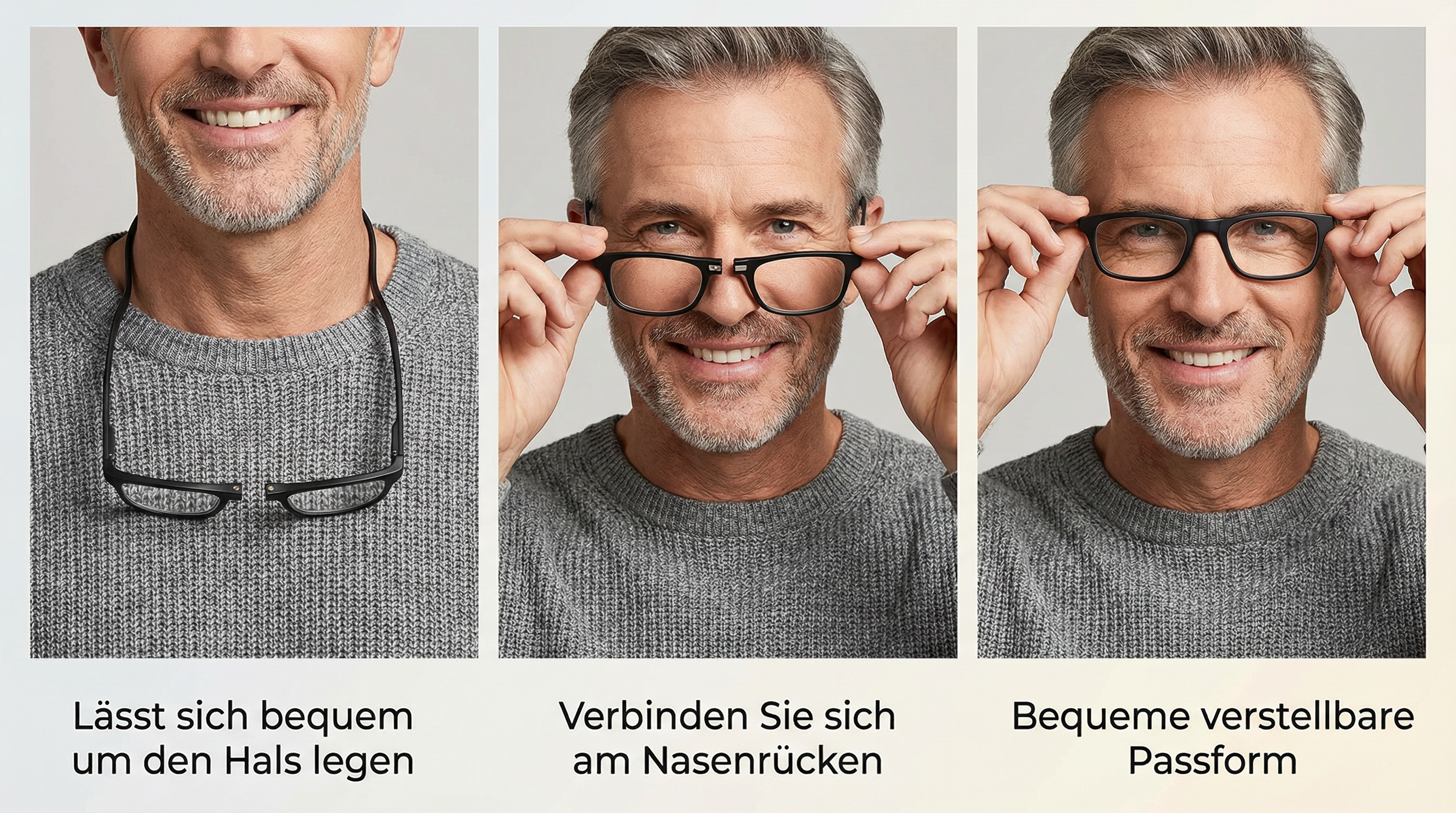 Die magnetische Lesebrille verwendet ein einzigartiges Magnet-Design, sodass Sie sich keine Sorgen mehr machen müssen, dass Ihre Brille herunterfällt oder verloren geht. Wenn Sie sie brauchen, führen Sie einfach die Enden zusammen und der Magnet schließt sich automatisch – so sitzt die Brille sicher. Wenn Sie sie nicht benötigen, kann sie locker vor der Brust hängen und Sie sind frei in Ihrer Bewegung.