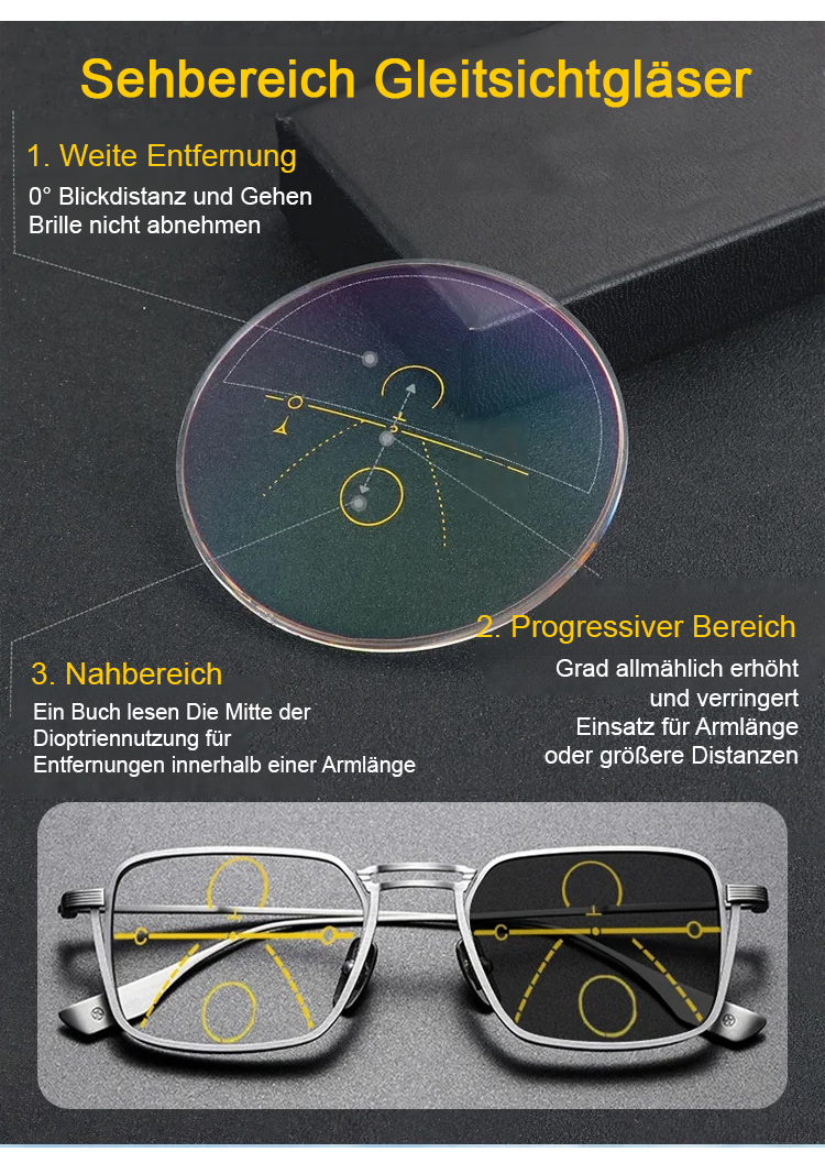 ● Fortschrittliche Mehrstärken-Gleitsichtgläser ermöglichen nahtloses Sehen in jeder Entfernung, perfekt für Lesen und Alltagsaktivitäten.