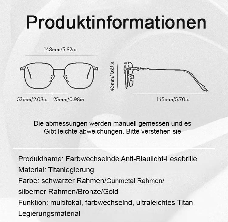 Titanlegierung Farbwechsel Mehrstärken Blaulichtschutz Gleitsicht-Lesebrille